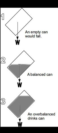In an empty can, the centre of gravity is also the geographic centre. The addition of mass inside the can, however, shifts the centre of gravity, thus changing how the can balances. With the correct amount added, the CoG can be shifted to allow weight to still act over the base even when the can is significantly tilted (2).